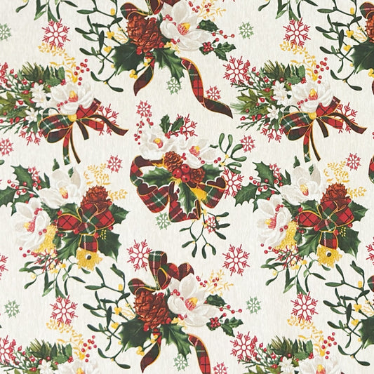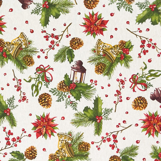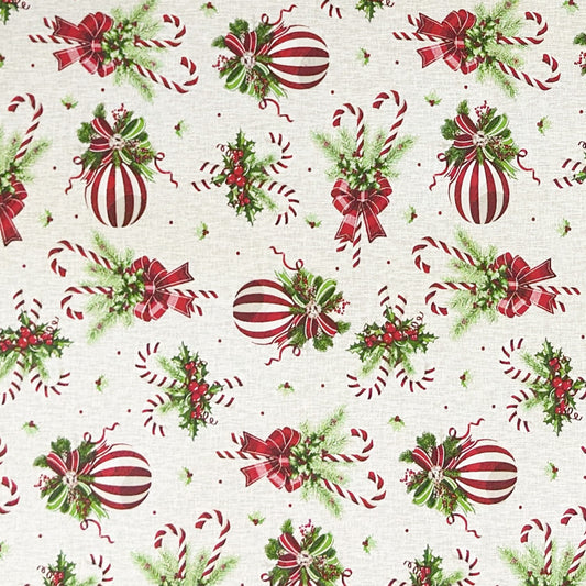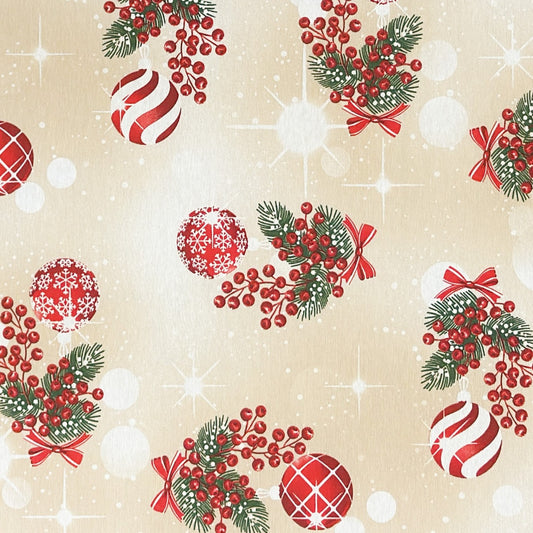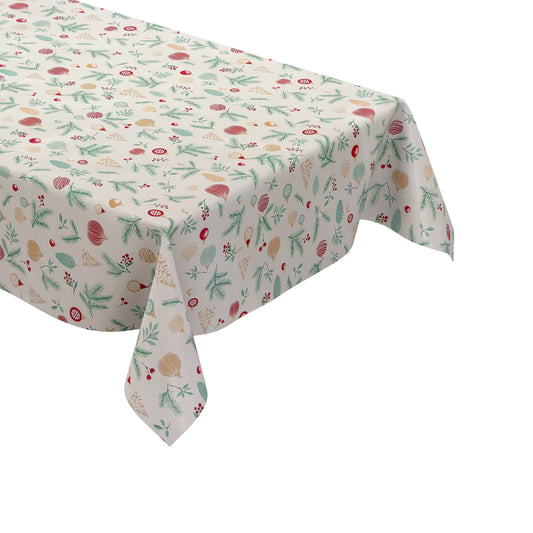 Jacquard Tischdecke aus beschichteter Baumwolle mit Fleckenschutz ESCARCHA beige Weihnachten Tannenzweige Weihnachtskugeln eckig rund oval