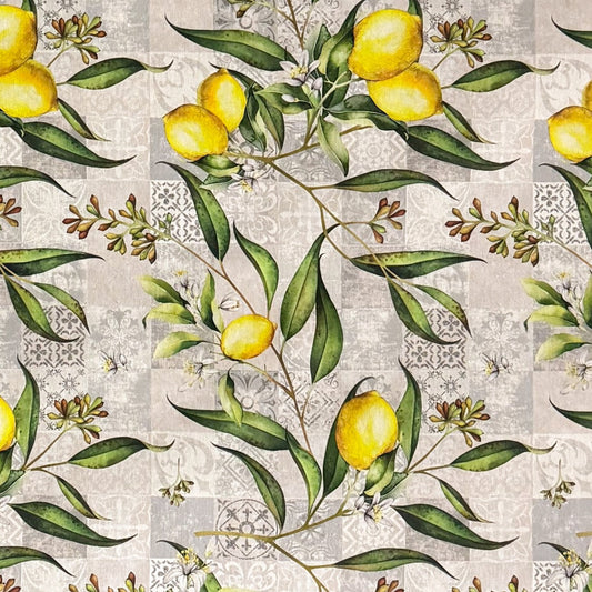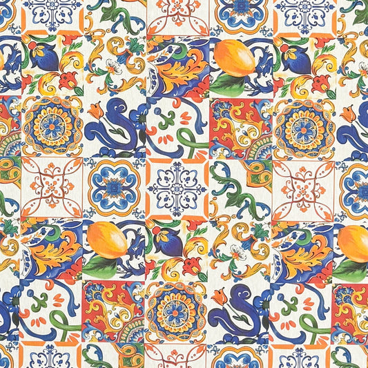 Nappe jacquard en coton enduit avec traitement antitache GENOVA mosaïque méditerranéenne citrons carrée ronde ovale