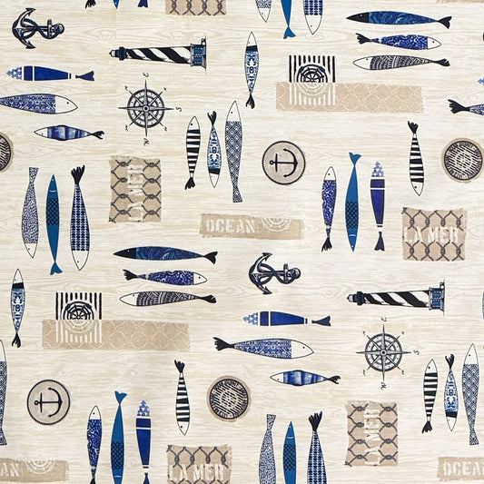 Nappe jacquard en coton enduit avec traitement antitache AQUARIUM ancre maritime phare poisson carré rond ovale
