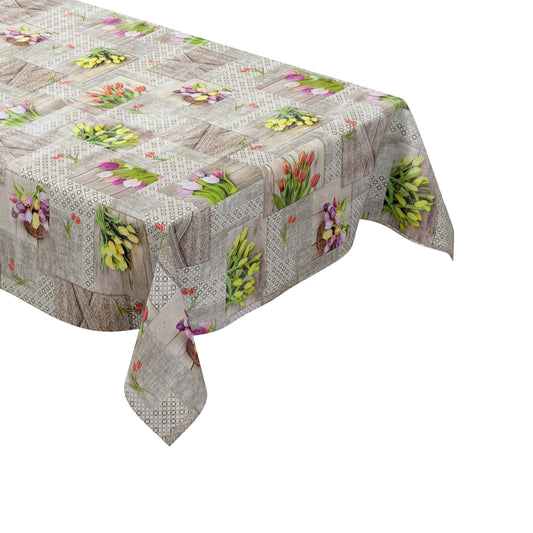 Nappe en toile cirée 15A tulipes printanières sur bois carrée ronde ovale