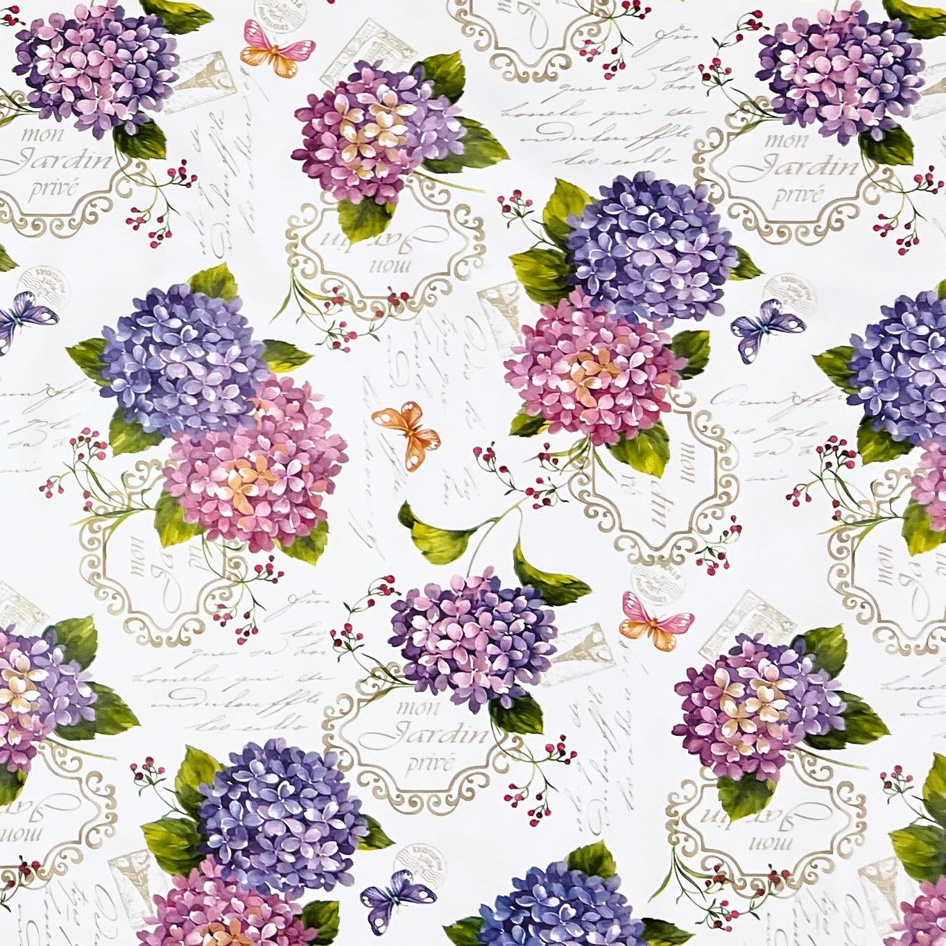 Nappe en toile cirée B9029-01 Fleurs d'hortensia sur ovale rond blanc angulaire